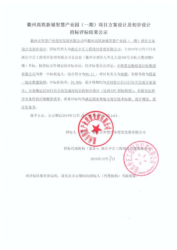 衢州市智慧產(chǎn)業(yè)投資發(fā)展有限公司的衢州高鐵新城智慧產(chǎn)業(yè)園(一期)項目方案設(shè)計及初步設(shè)計,招標代理人為浙江中正工程項目管理有限公司,于2019年12月17日在浙江中正工程項目管理有限公司會議室(衢州市西區(qū)九華北大道509號合屹大廈2#樓9樓)開標。按招標文件規(guī)定的評標辦法,經(jīng)評標委員會評定:中鐵第五勘察設(shè)計院集團有限公司為第一中標候選人,綜合得分為90.11 ,項目負責(zé)人為宋穎,資格等級為國家一級注冊建筑師;中標折扣率:78.88%;設(shè)計周期均為合同簽訂后15日歷天完成方案設(shè)計;方案確定后30日歷天內(nèi)完成深化后的初步設(shè)計(達到EPC招標程度),并提交達到評審條件的詳細概算清單。質(zhì)量目標均為滿足國家和地方現(xiàn)行技術(shù)標準、設(shè)計規(guī)范、設(shè)計任務(wù)書。