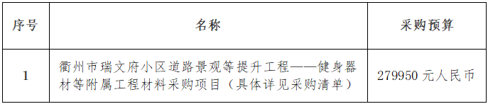 一、項(xiàng)目名稱:衢州市瑞文府小區(qū)道路景觀等提升工程——健身器材等附屬工程材料采購項(xiàng)目