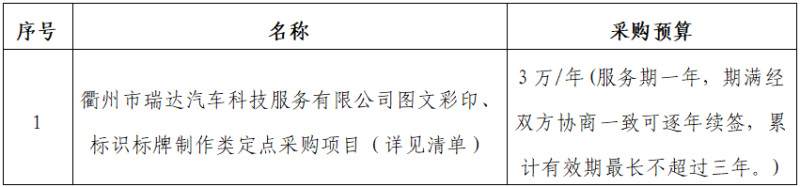 一、項目名稱:衢州市瑞達(dá)汽車科技服務(wù)有限公司圖文彩印、標(biāo)識標(biāo)牌制作類定點(diǎn)采購項目