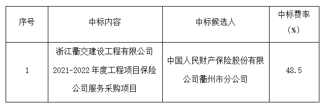 根據(jù)《中華人民共和國招標(biāo)投標(biāo)法》等有關(guān)法律法規(guī)的規(guī)定,浙江建安工程管理有限公司受浙江衢交建設(shè)工程有限公司委托,對(duì)其浙江衢交建設(shè)工程有限公司2021-2022年度工程項(xiàng)目保險(xiǎn)公司服務(wù)采購項(xiàng)目采用公開招標(biāo)方式進(jìn)行招標(biāo)。浙江建安工程管理有限公司于2021年08月17日09時(shí)30分在衢州市交通投資集團(tuán)二樓開標(biāo)廳(衢州市柯城區(qū)白云街道花園中大道86號(hào))進(jìn)行開評(píng)標(biāo)。評(píng)標(biāo)結(jié)果及相關(guān)事宜現(xiàn)公示如下: