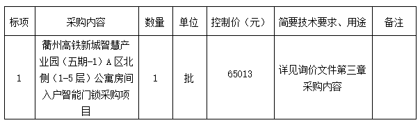 參照《衢州市國資委關(guān)于印發(fā)<衢州市國有企業(yè)采購管理辦法(試行)>的通知》(衢國資發(fā)[2020]36號)、《中華人民共和國政府采購法》、《政府采購貨物和服務(wù)招標投標管理辦法》等規(guī)定,衢州市智信工程咨詢有限公司受衢州市智慧置業(yè)有限公司、的委托,就衢州高鐵新城智慧產(chǎn)業(yè)園(五期-1)A區(qū)北側(cè)(1-5層)公寓房間入戶智能門鎖采購項目進行詢價,本項目為非依法必招項目,現(xiàn)請合格供應(yīng)商參加投標。