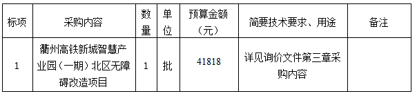 參照《中華人民共和國(guó)政府采購(gòu)法》、《政府采購(gòu)貨物和服務(wù)招標(biāo)投標(biāo)管理辦法》等規(guī)定,衢州市智信工程咨詢有限公司受衢州市智慧產(chǎn)業(yè)投資發(fā)展有限公司的委托,就衢州高鐵新城智慧產(chǎn)業(yè)園(一期)北區(qū)無(wú)障礙改造項(xiàng)目進(jìn)行詢價(jià),本項(xiàng)目為非依法必招項(xiàng)目,現(xiàn)請(qǐng)合格供應(yīng)商參加投標(biāo)。