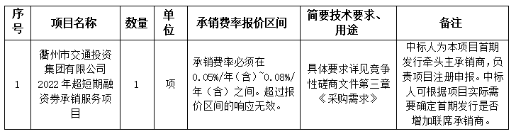 項(xiàng)目?jī)?nèi)容及規(guī)模:衢州市交通投資集團(tuán)有限公司擬申報(bào)超短期融資券40億元人民幣,發(fā)行期限不超過(guò)270天(采取分期發(fā)行,發(fā)行金額以采購(gòu)人實(shí)際需求為準(zhǔn)),采用余額包銷的方式承銷。