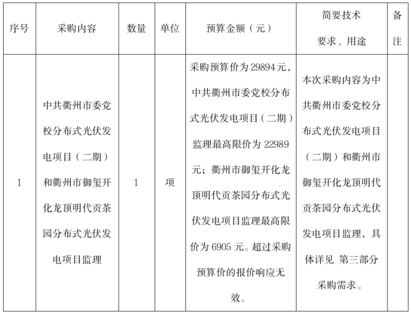 中共衢州市委黨校分布式光伏發(fā)電項(xiàng)目(二期)和衢州市御璽開化龍頂明代貢茶園分布式光伏發(fā)電項(xiàng)目監(jiān)理的詢價(jià)公告(非政府采購(gòu))