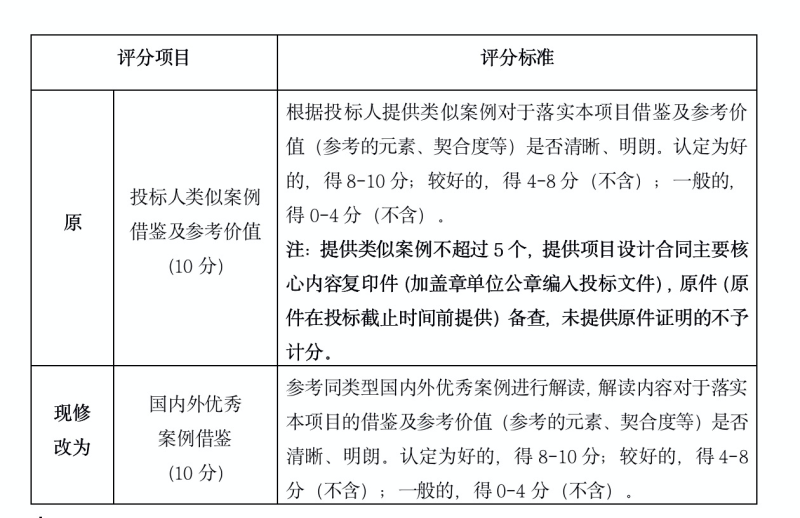 1、招標(biāo)文件第三章評(píng)標(biāo)辦法(綜合評(píng)估法)技術(shù)部分評(píng)分標(biāo)準(zhǔn)“投標(biāo)人類似案例借鑒及參考價(jià)值(10分)”作如下修改: