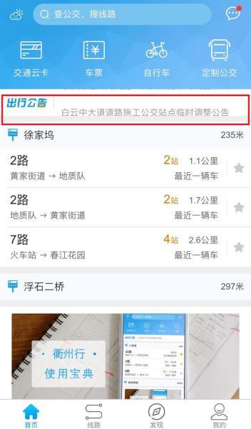 一、衢州行APP。在衢州行首頁出行公告欄中會滾動彈出查詢公交公司發(fā)布的相關公告(如下圖),市民可以根據(jù)各自的需求進行查詢;