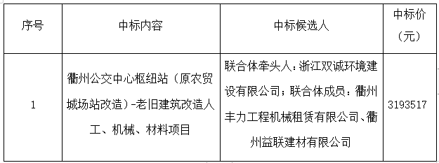 根據(jù)《中華人民共和國(guó)招標(biāo)投標(biāo)法》等有關(guān)法律法規(guī)的規(guī)定,浙江建安工程管理有限公司受浙江衢交建設(shè)工程有限公司委托,對(duì)其衢州公交中心樞紐站(原農(nóng)貿(mào)城場(chǎng)站改造)-老舊建筑改造人工、機(jī)械、材料項(xiàng)目采用公開(kāi)招標(biāo)方式進(jìn)行招標(biāo)。浙江建安工程管理有限公司于2021年6月16日09時(shí)30分在衢州市交通投資集團(tuán)二樓開(kāi)標(biāo)廳(衢州市柯城區(qū)白云街道花園中大道86號(hào))進(jìn)行開(kāi)評(píng)標(biāo)。評(píng)標(biāo)結(jié)果及相關(guān)事宜現(xiàn)公示如下: