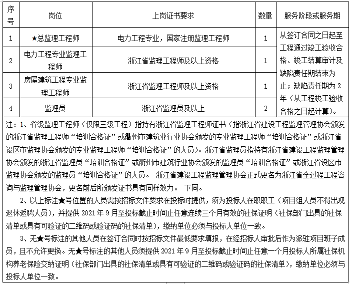 要求投標(biāo)人須是具有獨立法人資格,具備建設(shè)行政主管部門核發(fā)的工程監(jiān)理綜合資質(zhì)或具備電力工程監(jiān)理乙級及以上資質(zhì),且資質(zhì)在有效期內(nèi)的企業(yè);浙江省外企業(yè)須持有浙江省住建廳出具的《省外企業(yè)進(jìn)浙承接業(yè)務(wù)備案證明》或提供“浙江省建筑市場監(jiān)管公共服務(wù)系統(tǒng)”上發(fā)布的備案信息截圖。
