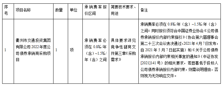項目內(nèi)容及規(guī)模:衢州市交通投資集團有限公司計劃向上海(或深圳)證券交易所申報公司債券,申報總規(guī)模不超過40億元,發(fā)行期限不超過10年,擬通過競爭性磋商方式確定本項目承銷商,為采購人提供本項目申報發(fā)行等相關(guān)事項,具體要求詳見采購內(nèi)容。