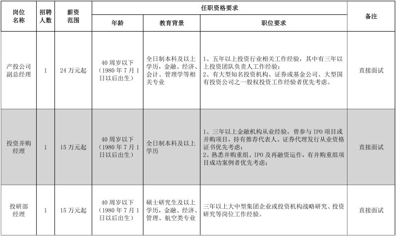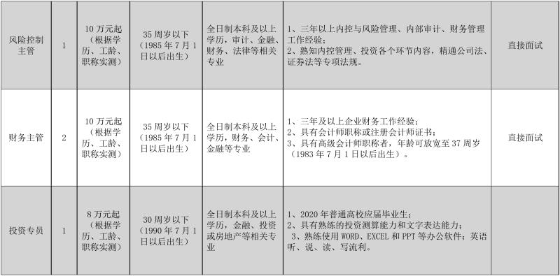 2、產(chǎn)投公司副總經(jīng)理、投資并購經(jīng)理、投研部經(jīng)理、風險控制主管、財務主管五個崗位采用直接面試形式,報名人員通過資格審查后進入面試環(huán)節(jié)。